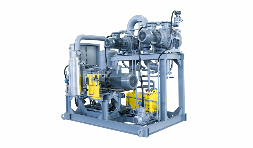 沃爾姆技術(shù)團(tuán)隊(duì)通過現(xiàn)場(chǎng)測(cè)試發(fā)現(xiàn),液環(huán)泵工作液(自來水)在 38℃時(shí)汽化壓力達(dá) 6610Pa,主羅茨泵吸排氣壓差達(dá)到10kPa,導(dǎo)致羅茨泵無法啟動(dòng)。綜合考慮客戶對(duì)于節(jié)能增產(chǎn)的需求,于是制定方案將液環(huán)羅茨機(jī)組升級(jí)為螺桿羅茨機(jī)組(DMY600羅茨泵 +DMY300羅茨泵+ ESDP900螺桿泵),機(jī)組不再受夏季溫度影響,能夠全年高效工作。